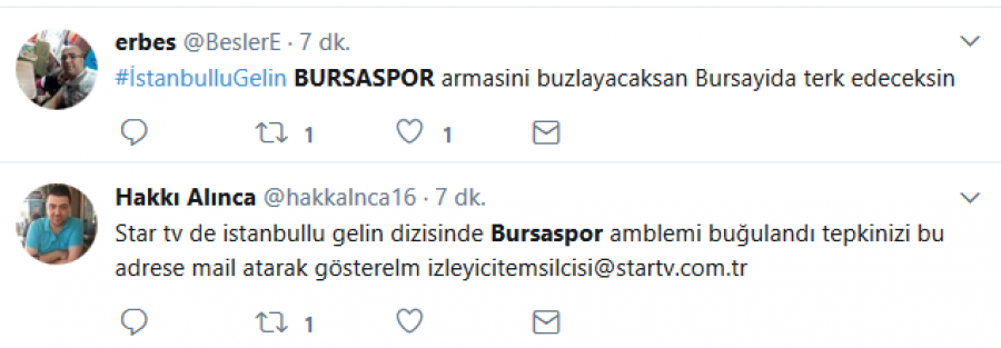 29.09.2017 Cuma günü yayınlanan İstanbullu Gelin dizisinde flulanan Bursaspor amblemi hususunda şikayetçiyim.Yaptığınızın çok büyük bir ayıp olduğunu ve ekmek kazandığınız şehre ihanet olduğunu düşünüyorum.Sorununuzun ne olduğunu bilmiyorum ancak bu şekilde yaparak pozitif reklam yaptığınızı düşünüyorsanız yanılıyorsunuz.Bursa şehri üç milyon nüfusa sahip bir şehir.Küçümsenmeyecek bu rakamın tepkisini çekmek size ne kazandırıyor bilmiyorum ancak bir daha ki sefer daha dikkatli olmanızı önemle rica ediyorum.Aynı hususun tekrar yaşanması durumunda ilgili mercilere hukuki anlamda işlemde bulunacağımı tarafınıza iletirim.