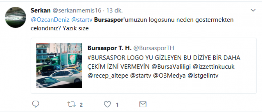 Yıllardır Tvlerdeki dizilerde 3 Bizans Kulübünün akla hayale gelmeyecek reklamları yapılırken,dizi çekimi sırasında tesadüfen kadraja giren bir Bursaspor Logosunu buzlamak tam anlamıyla alçaklıklıktır,bunu kimse kimseye ticari reklam sözkonusu acaba Bursaspor Kulübü benden logomu izinsiz yayınladın şikayetçi olurum gibi kaygılardan dolayı böyle bir uygulama yapıldı diye hafifletmeye çalışamaz !!!