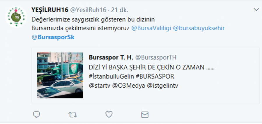 Şimdiden dizinizi izlemeyi bırakmış olup çevremdeki herkese bunu duyuruyorum, herkesin bu isteğime olumlu tepki verdiğini görüyorum, size önerim ya bu yanlıştan bir an evvel dönüp tüm kamuoyu önünde Bursamız ve Bursasporumuzudan özür dilemeniz ya da Bursamızın sembolünü, armasını buzlamaya devam edecekseniz, BUrsamızı terk edip dizinizi değerlerine saygı göstermediğiniz de tepki göstermeyecek olan şehirlerde yayınlamanızı rica ediyorum.