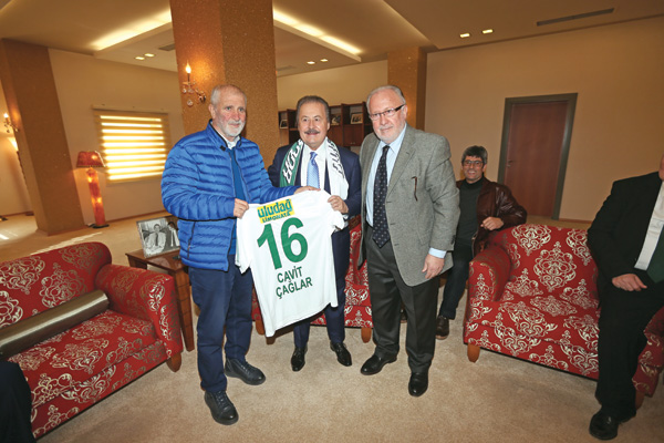 “Hepimizde emeği ve hakkı var. Benim Bursaspor’da oynamamdan başlayarak, yöneticiliğe kadar gelmemde katkısı büyük. Teşekkür ediyorum, her zaman yanımızda olduğunu biliyoruz.” Samimi bir sohbetin ardından Bursaspor’un esfane oyuncularından Mesut Şen, Çağlar’a üzerinde adının yazılı olduğu Bursaspor forması, eski kaptan Sinan Bür de, yeşil beyaz bir atkı armağan etti. Cavit Çağlar, konuklarını ardından yemekte ağırladı.