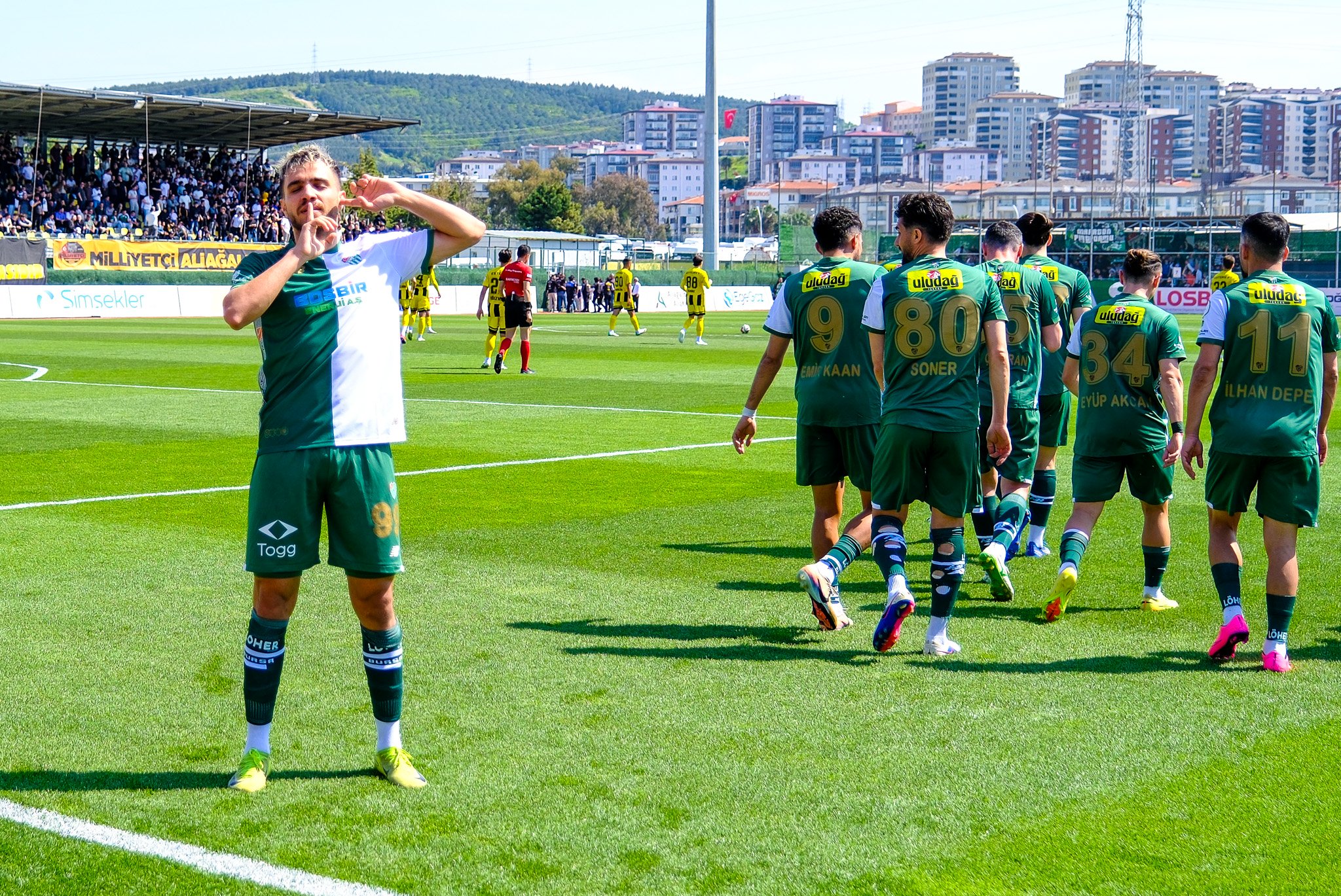 12′ GOOOLLL… Bursaspor kontra atağında İlhan Depe topu hızla rakip yarı sahaya taşıdı. Aliağa savunmasının az adamla yakalanmasıyla pozisyonda 5’e 1 üstünlük oluştu. İlhan’ın pasıyla buluşan Ertuğrul İdris Furat, düzgün bir vuruşla meşin yuvarlağı ağlara gönderdi. Bu golle Ertuğrul İdris Furat hem kendisinin hem de takımının ikinci golünü kaydetti.
