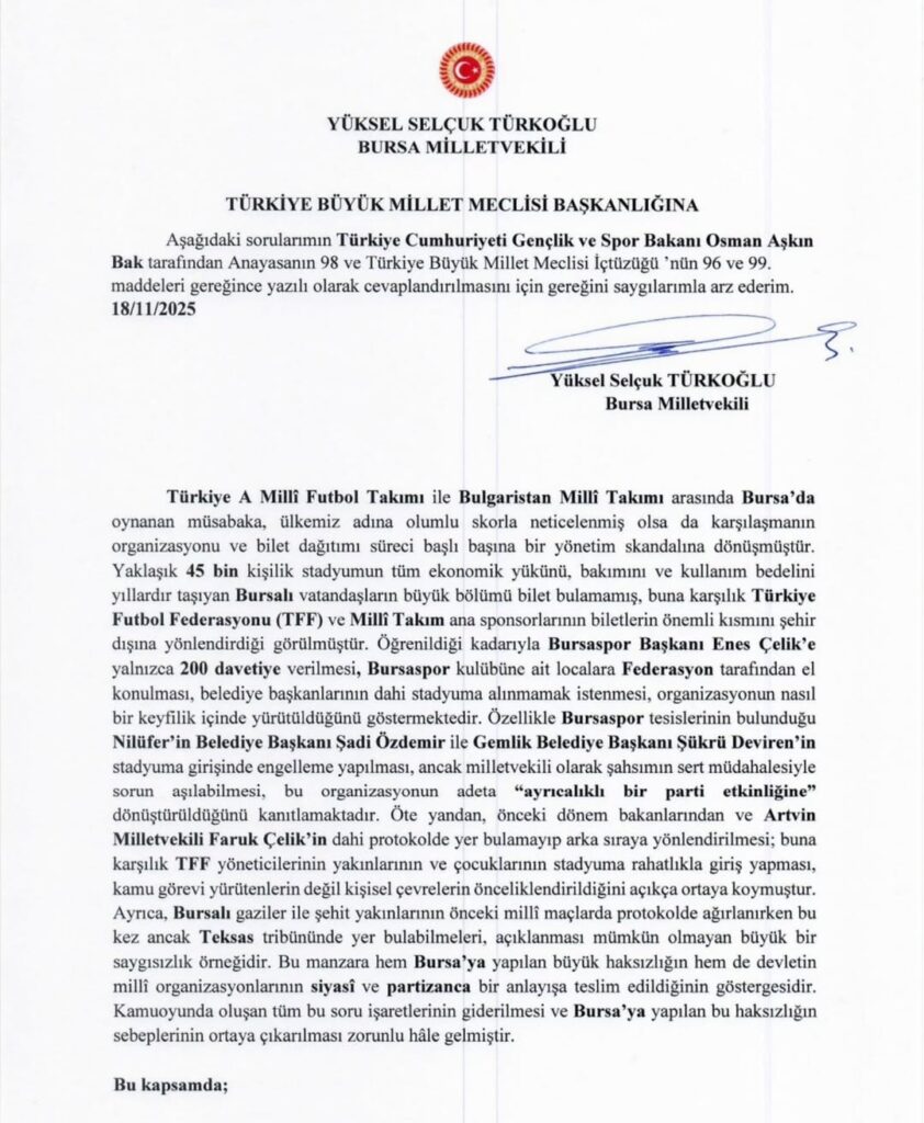 İYİ Parti Bursa Milletvekili Selçuk Türkoğlu, Bursa’da oynanan Türkiye–Bulgaristan milli maçında yaşanan bilet organizasyonu krizini TBMM gündemine taşıdı.