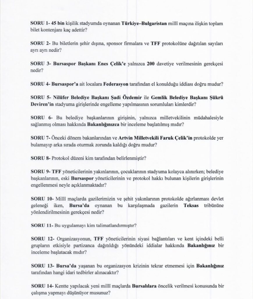 Türkoğlu, maç günü yaşandığını belirttiği “skandal uygulamaları” 14 maddelik soru önergesiyle Gençlik ve Spor Bakanlığı’na yöneltti.