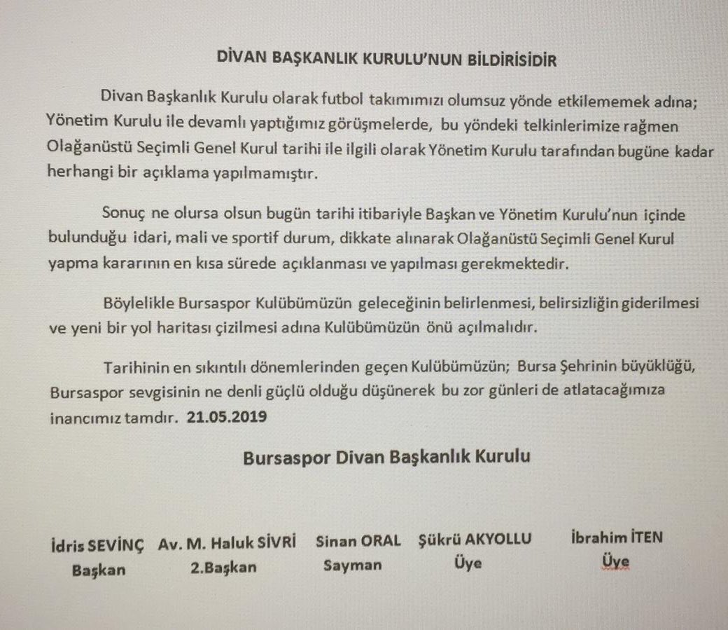 Bursaspor Divan Başkanlık Kurulu Başkanlığı Ali Ay Yönetimine olağanüstüsü kongreye gidilmesi yönünde çağrıda bulundu