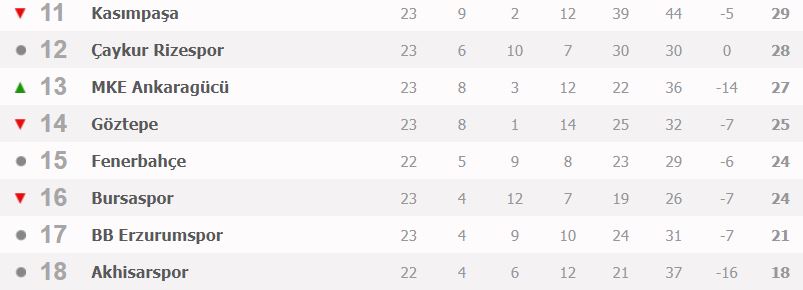 Bursaspor: Sıra: #18 | 4 galibiyet / 12 beraberlik / 18 mağlubiyet | Attığı gol: 19 / Yediği gol: 40 | Averaj: -21 | Puan: 24