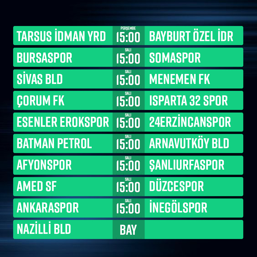 Bursaspor, ligin son maçında ise bu haftayı bay geçecek ve düşmenin önemli adaylarından 45 puanlı Nazilli Belediyespor ile 20 Mayıs Cumartesi günü deplasmanda karşı karşıya gelecek. Yeşil-beyazlı ekip, 16 Mayıs’ta Somaspor’u mağlup ettiği taktirde ligde kalmayı garantileyecek.