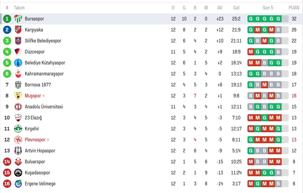 10. Karşıyaka’nın işi çok zor Silifke Kütakya ve bizimle 3 hafta üstüste oynayacak ve formda değiller. 3 hafta daha disiplinimizi bozmadan mücadelemizi sürdürürsek 10 puandan fazla farkla devre arasına gireriz. Sene ortasından başlayarak sonraki yılın yapılanmasını ve eksiklerine odaklanabileceğiz. Bu önümüzdeki yılın şampiyonluğunu bile şimdiden garantiye almak anlamına gelebilir. Haydi Bursam…