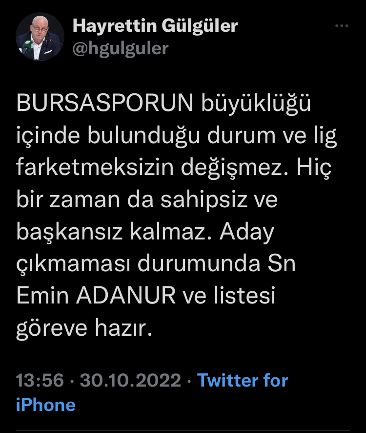 Gülgüler “Bursaspor’un büyüklüğü içinde bulunduğu durum ve lig farketmeksizin değişmez. Hiç bir zaman da sahipsiz ve başkansız kalmaz. Aday çıkmaması durumunda Sn Emin Adanur ve listesi göreve hazır.” ifadelerini kullandı.