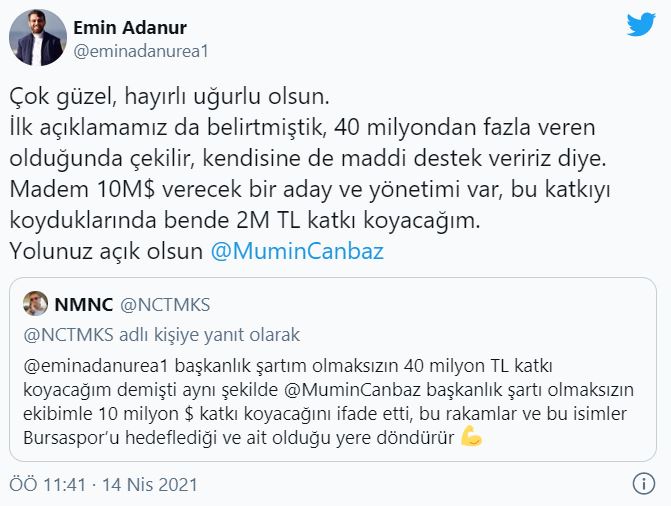 Madem 10M$ verecek bir aday ve yönetimi var, bu katkıyı koyduklarında bende 2M TL katkı koyacağım. Yolunuz açık olsun’