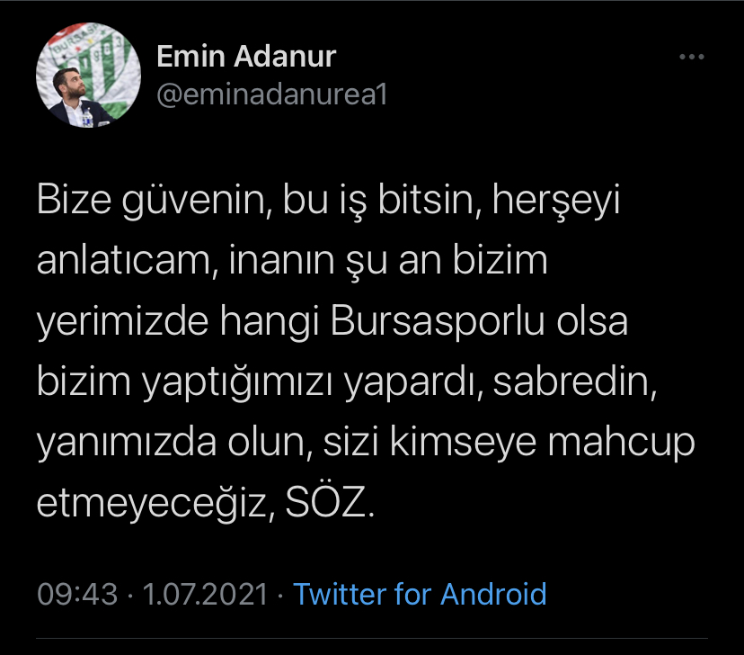 Camiadan kendilerine sabır gösterilmesini isteyen Emin Adanur paylaşımında “Bize güvenin, bu iş bitsin, her şeyi anlatıcam, inanın şu an bizim yerimizde hangi Bursasporlu olsa bizim yaptığımızı yapardı, sabredin, yanımızda olun, sizi kimseye mahcup etmeyeceğiz, SÖZ.” ifadelerini kullandı.