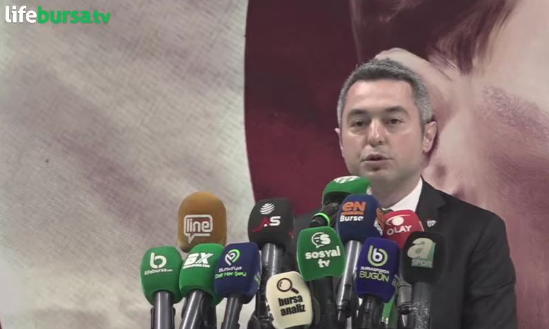 Bursaspor Kulübü Başkanı Ömer Furkan Banaz, İbrahim Yazıcı Özlüce Tesislerinde basın toplantısı düzenliyor.