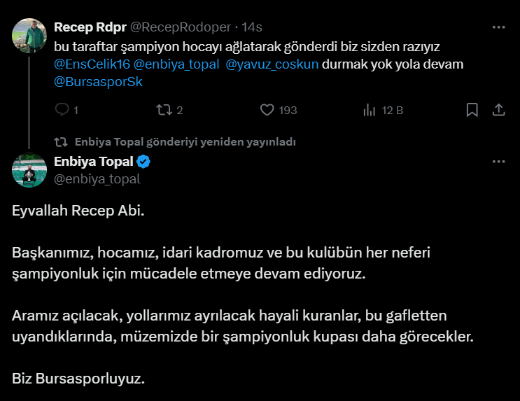 Sayın Enbiya bey ; Sizlerin yaptıklarınızı her daim destekleyen biri olarak bu ayrıştırıcı üslubun yanlış olduğunu düşünüyorum , Yönetim birleştirici olmalıdır , Eleştirenleri , size göre yanlış düşüncede olsalar dahi Bursaspor düşmanıymış gibi lanse etmeniz hoş olmuyor, Herkes Bursaspor un daha iyi olmasını istiyor. Bunun için bir görüş bildiriyor. Bugüne kadar kimsenin yönetime laf ettiğini duymadım , görmedim , işitmedim . Bu açıklamınız sizi destekleyen savunan bir olarak açıkçası beni rahatsız etti.