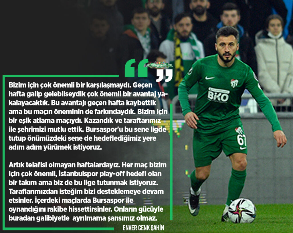 Artık telafisi olmayan haftalardayız. Her maç bizim için çok önemli, İstanbulspor play-off hedefi olan bir takım ama biz de bu lige tutunmak istiyoruz. Bunun için elimizden gelen her şeyi yapacağız. Taraflarımızdan isteğim bizi desteklemeye devam etsinler. İçerdeki maçlarda Bursaspor ile oynandığını rakibe hissettirsinler. Onların gücüyle buradan galibiyetle ayrılmama şansımız olmaz.” ifadelerini kullandı.