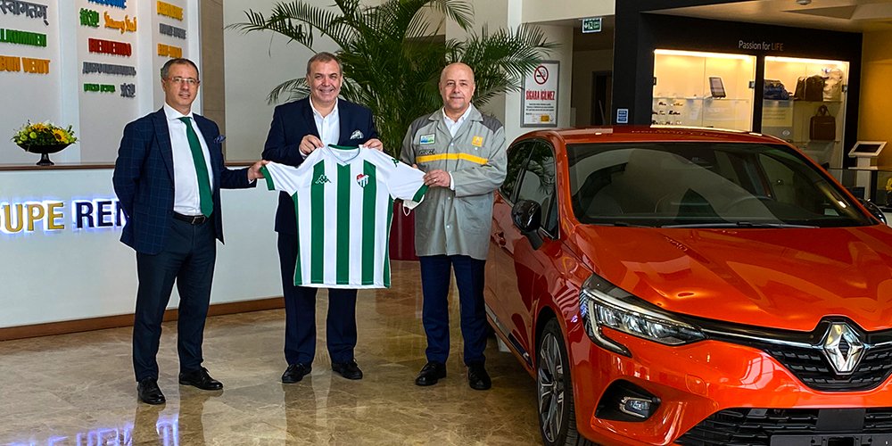 Renault ile Bursaspor’u yan yana görmek istediklerini belirten Bursaspor Kulübü Başkanı Erkan Kamat, Oyak Renault Genel Müdürü Antoine Aoun ve Kurumsal İlişkiler Direktörü Selim Akbaş’a forma takdiminde bulundu ve yılın otomobili Renault Clio 5‘i inceleyerek Bursa‘da üretilen diğer araçlar hakkında bilgi aldı.