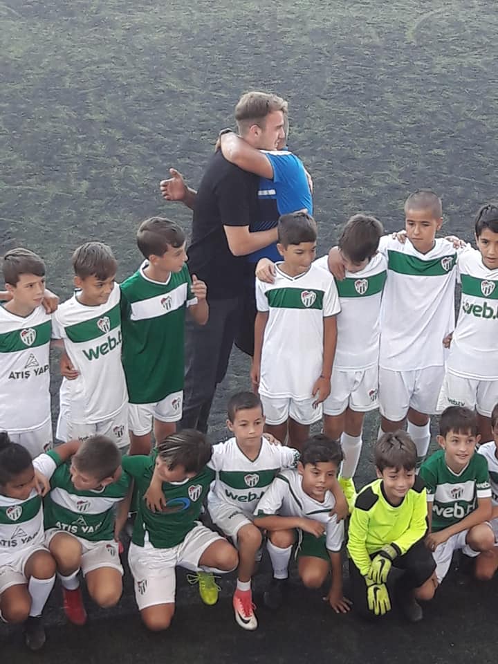 Bursaspor Futbol Okullar Koordinatörü Hakan Cenkçiler‘i Merinos Stadı‘nda ziyaret eden Ertuğrul Ersoy çocuklar ile birlikte vakit geçirdi. Cenkçiler ve çocuklarla vedalaşıp fotoğraf çektiren Ertuğrul Ersoy minik timsahlara öğütlerde bulundu.