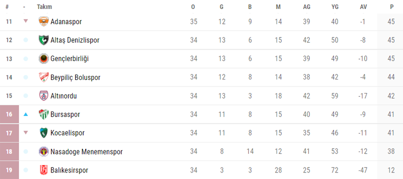 Adana nın deplasmanda Kocaeli ile çok zorlu 1 maçı kaldı. Son maçlara göre ligi 45 yada 47 puanla bitiririz. 45 puan olursa ikili averaja göre Adana bizim üstümüzde olur.