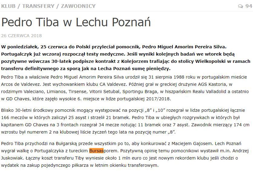 Polonya basının Portekizli orta saha oyuncusu Pedro Tiba ile Bursaspor'un da ilgilendiğini ancak Lech Poznan'ın transferi gerçekleştirdiğini yazdı.