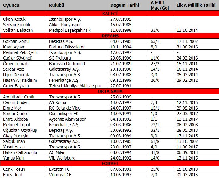 A Milli Takım Teknik Direktörü Mircea Lucescu tarafından belirlenen kadroda şu isimler yer alıyor:
