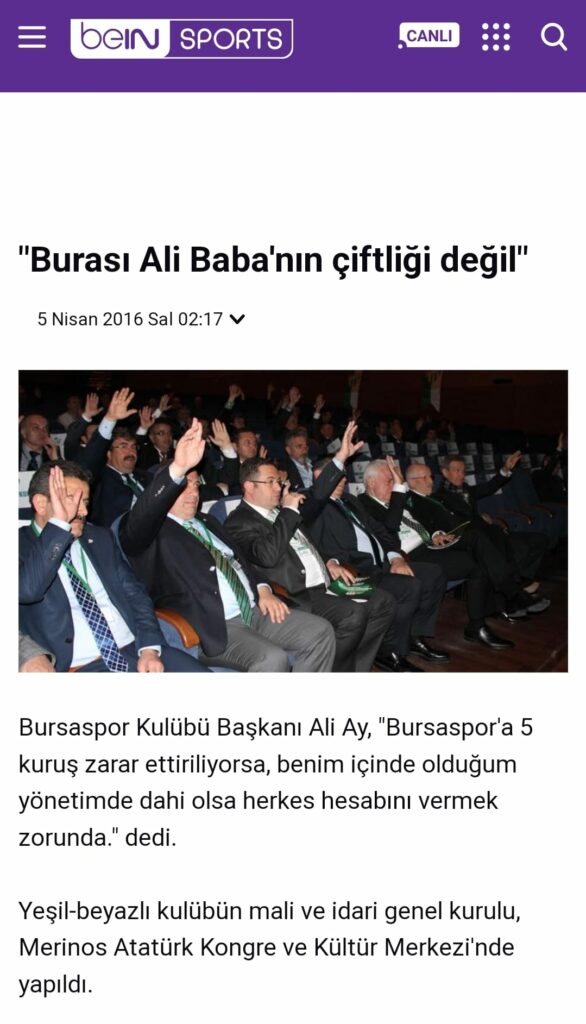 Malasef öyle ben Ali ay gelsin diye yanıp tutuşmuyorum ama kulübü Selim Kurtulan ve Sedat Topaloğlu’nun yönetmesinide kabul etmiyorum. Kimsenin anlamadıgı bir şey var belediye destekli banaz yönetimi ile bile son anda kümede kaldık. Böyle yaparak buradan çıkacagımıza inanmak bunlara inanmak hayalcilik olur. Ve bunlarin bir sey yaptıgı yok kulübde sigara keyfi yapiyorlar daha geçengün faceye paylaşım atmışlar arkada İbrahım yazıcı yöneticiler short ile oturmuş utanmadan poz veriyorlar yönetim odasında. Bunlara inanan varsa kusura bakmasınlar Bursaspor’un kapanmasını isteyen Bursaspor düsmanıdır