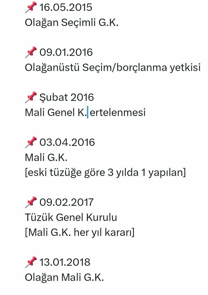 Yani 2016‘da eski tüzüğe göre 3 yıl için yapılan mali genel kurul tüzük değişimi sonrası ilk mali genel kurula kadar boşluk olmadan kapsayıcı şekilde yapıldığı için 2017‘de mali genel kurul gerçekleştirilmemiş. Yeni tüzüğü takip eden ilk mali genel kurul da zamanında yapılmış gözüküyor.