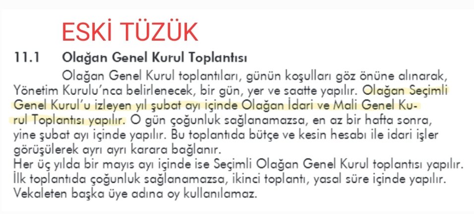 metin kardeşim bu yönetim kendi kafasına göre yasaları yorumlamıyor dikkat edersen 16 05 2015 yılında bir genel kurul toplantısı var bu toplantıdan 6 ay sonra ise o günkü yönetimin borçlanma yetkisi almak adına genel kurul un yeniden toplandığı ortada ama ALİ AY döneminde borçlanma yetkisi almak için her hangi bir toplantı yok ortada genel kurul rutin toplantıları zamanın da yapılsa da borçlanma yetkisini vermek için tekrardan gün tarih bir önceki toplantının ne zaman yapıldığına bakılmaz başkan ve yönetime borçlanma yetkisi vermek veya vermemek adına toplanmak ve onay vermek veya red kararı vermek zorunluğu vardır ALİ AY yönetimine borçlanma yetkisi 2017 yılında yapılmamış 2018 yılında ise rutin genel kurul toplantısı var . borçlandırma yetkisi diye bir ibare yok