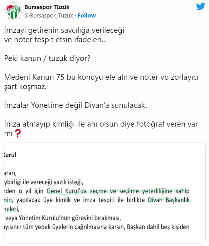 Bursaspor Tüzük hesabı yaptığı paylaşımda şu ifadeler yer aldı;