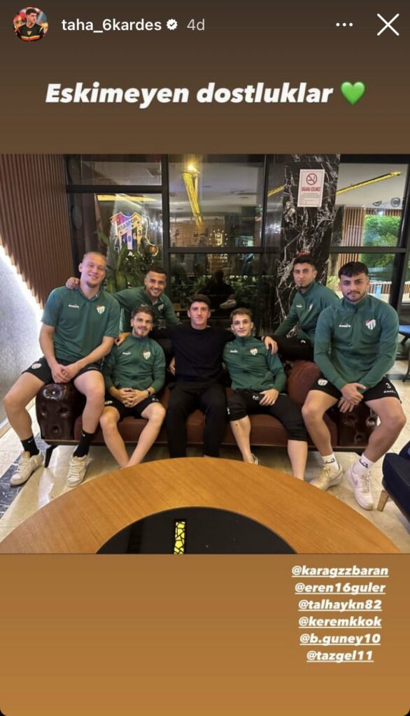 Göztepe forması giyen eski Bursasporlu futbolcu Taha Altıkardeş, Bucaspor 1928 maçı için İzmir’de kampa giren Bursasporlu oyuncuları ziyaret etti. Taha bu anları sosyal medya hesaplarından “Eskimeyen dostluklar ” mesajı ile paylaştı.