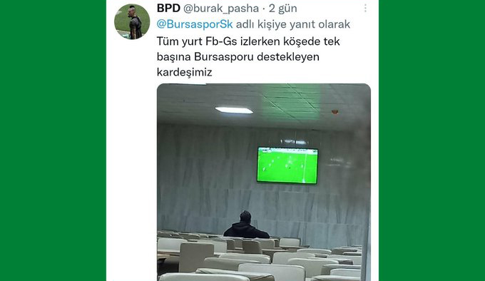 Herkes Fenerbahçe - Galatasaray derbisini izlerken, tek başına Bursaspor - Kocaelispor maçını izleyen bu taraftar sosyal medyada gündem oldu.