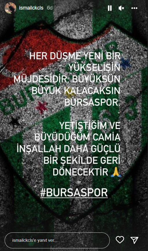 İsmail Çokçalış paylaşımında “Her düşme yeni bir yükselişin müjdesidir. Büyüksün, büyük kalacaksın Bursaspor. Yetiştiğim ve büyüdüğüm camia inşallah daha güçlü bir şekilde geri dönecektir.” ifadelerini kullandı.