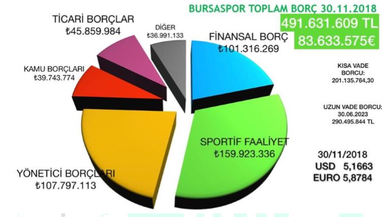 Bursaspor Kulübü Bağımsız Denetleme Kurulu tarafından yapılan değerlendirme sonucu Bursaspor Kulübü‘nün borcunun toplamda 491 milyon 631 bin 609 ₺ olduğu görülüyor.