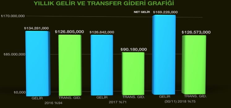 3-) 2018 Transfer Gideri (Bonservis, kiralama, menajerlik, futbolcu ve teknik kadro) 126.573.755 TL’dir. Bu rakam 2018 net gelirimiz olan 169.228.000TL’nin %75’ine denk gelmektedir. Yani yıllık gelirimizin %75 i bu borç kalemine harcanmaktadır. Bu transfer gideri içerisinde 12.203.387,82 TL Sporcu Sözleşme fesih bedeli vardır. Bu rakam Yıllık sabit olan 120.000.000-TL Gelirimizin %10’unu bulmuştur. Bu nedenle Transfer hatalarını minimum seviyeye indirmeliyiz.