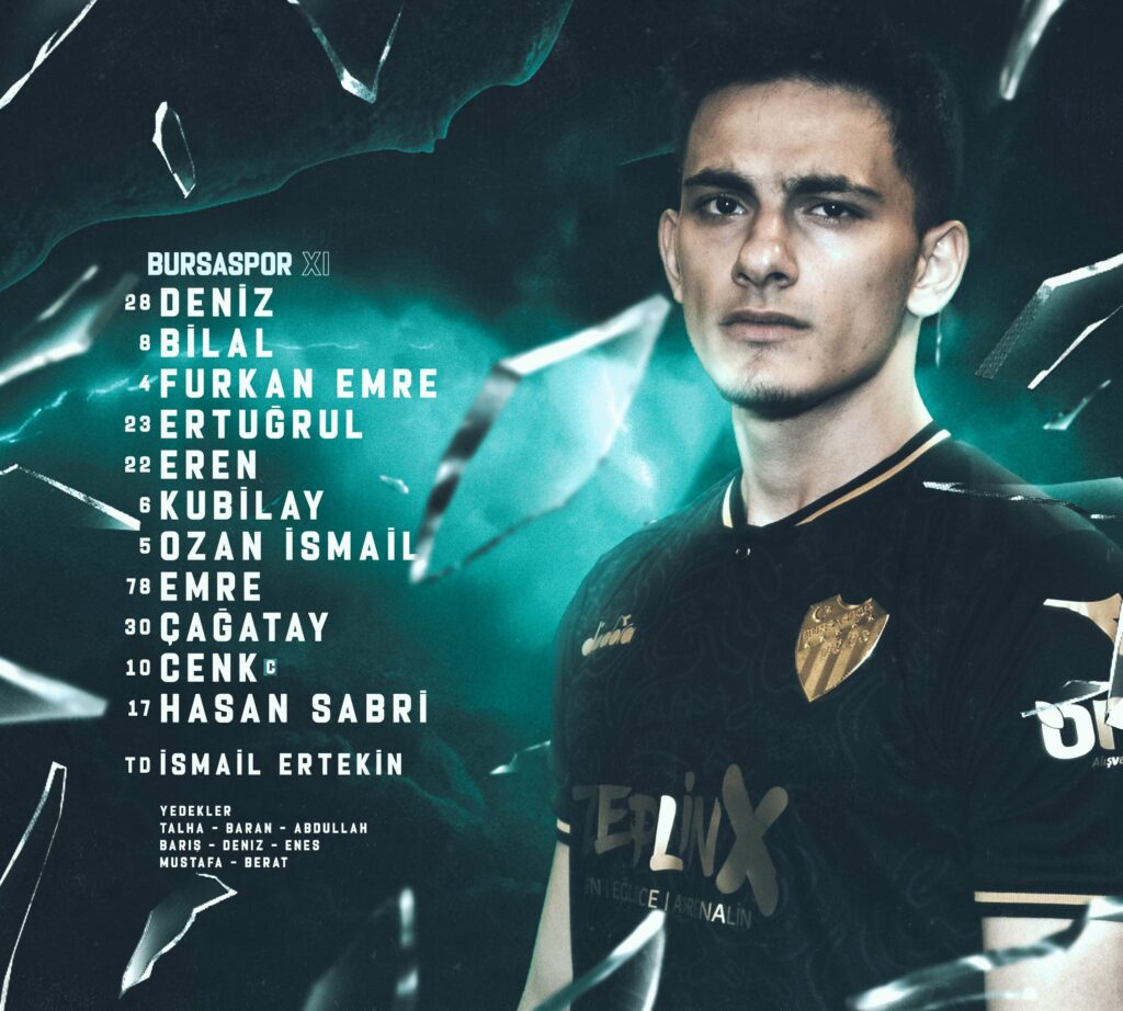 Bursaspor Teknik Direktörü İsmail Ertekin‘in sahada Deniz Aydın, Eren Tunalı, Ertuğrul Kurtuluş, Furkan Emre Ünver, Bilal Güney, Ozan İsmail Koç, Kubilay Sönmez, Emre Tepegöz, Çağatay Yılmaz, Enver Cenk Şahin, Hasan Sabri Karaca 11’i ile yer aldı.