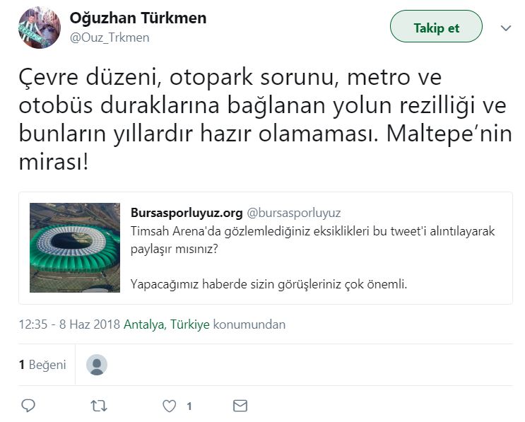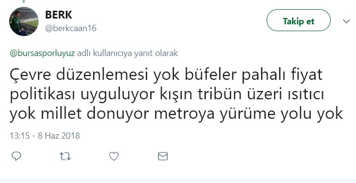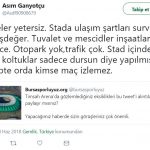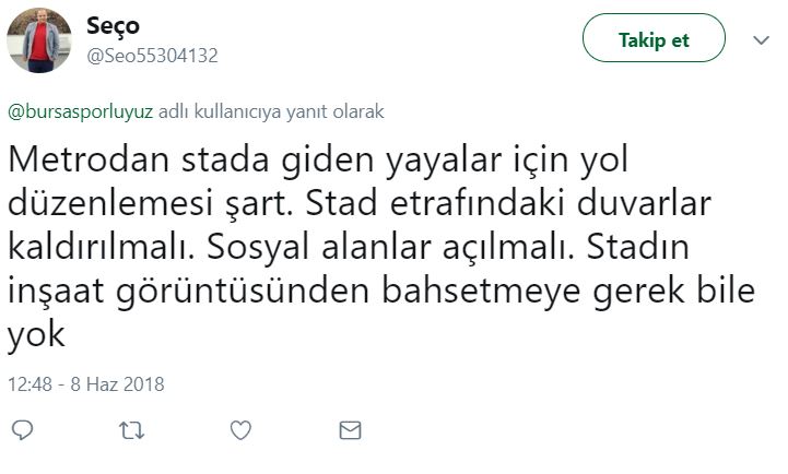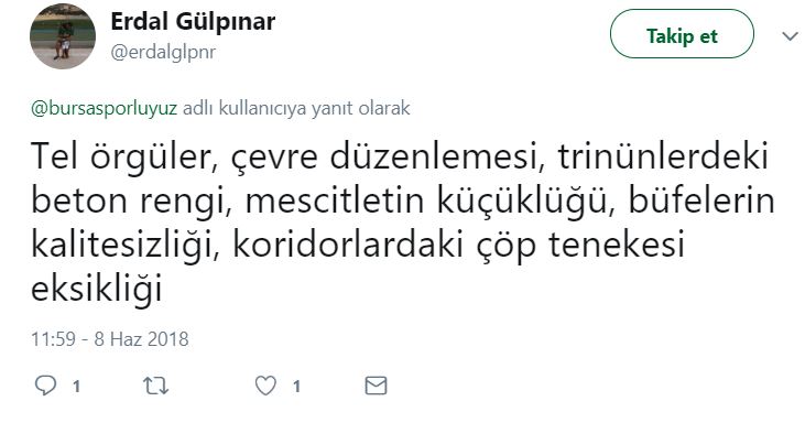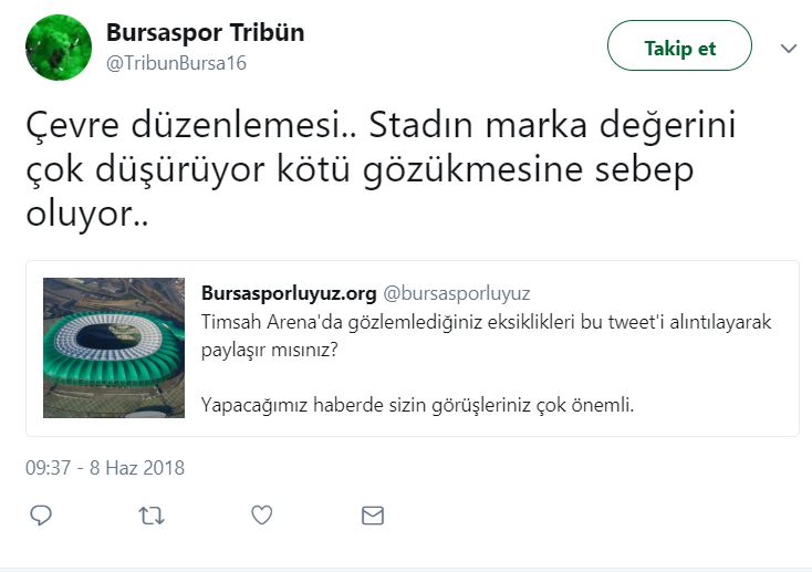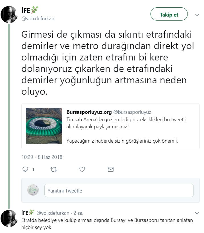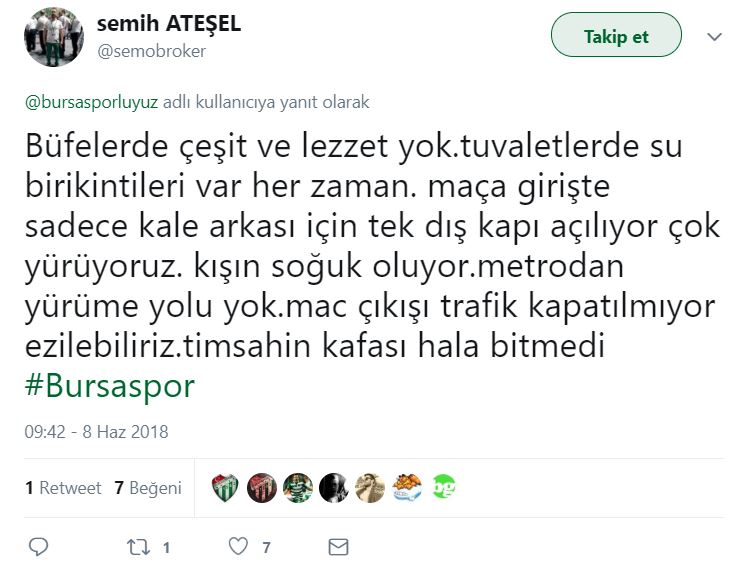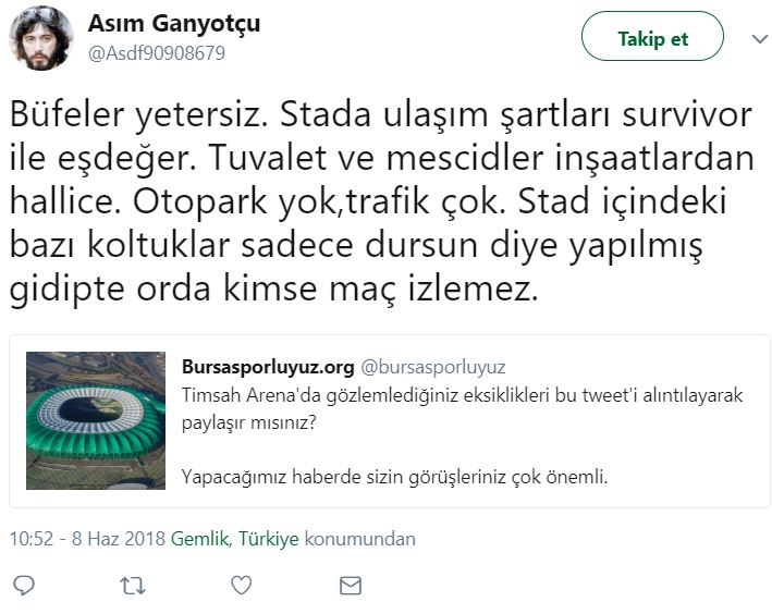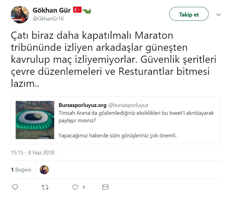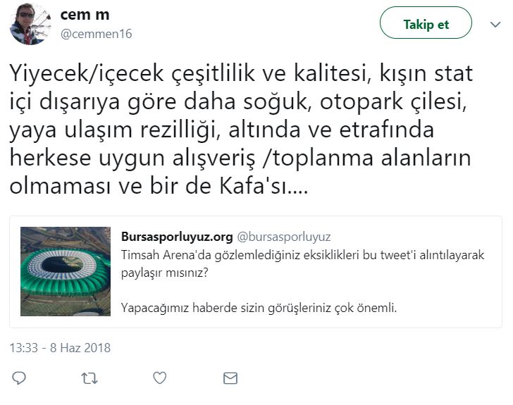 Ulaşım bir dert başlı başına, sosyal alan yok, otopark sıkıntısı , maç çıkışlarını ise anlatmaya gerek yok , yollar yapılmamış, stadyuma gelirsek, stadyumu çevreleyen teller kesinlikle kaldırılmalı, timsah kafası ve stadyum içinde eksikler var, kale arkasındaki tel örgüler kaldırılmalı, maratondaki Bursa yazısı yerine Bursaspor yazılmalı koltukları ona göre dizayn edilmeli çünkü Bursaspor sadece futbol kulübü değildir, bir spor kulübüdür.Üç sıra boş bırakılmamalı,ön sıralara yağmur gelmekte çatıya koruma yapılmalı….Yani kısacası stadyumda eksikler var kaldırılması gereken işler var…Deplasman maçlarına mı geliyoruz yoksa kendi sahamızda maça mı geliyoruz belli değil..Timsah arenayı aktif ve yaşanabilir bir alan olması gerekir.