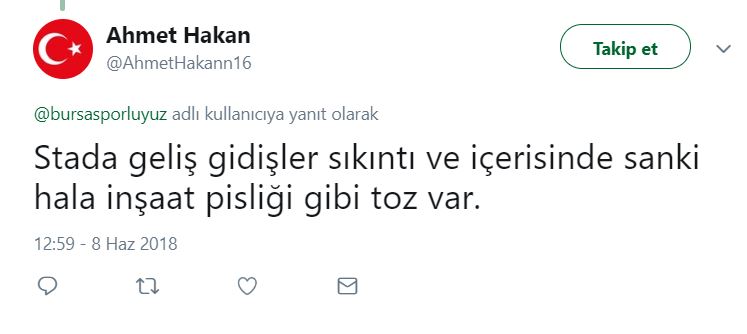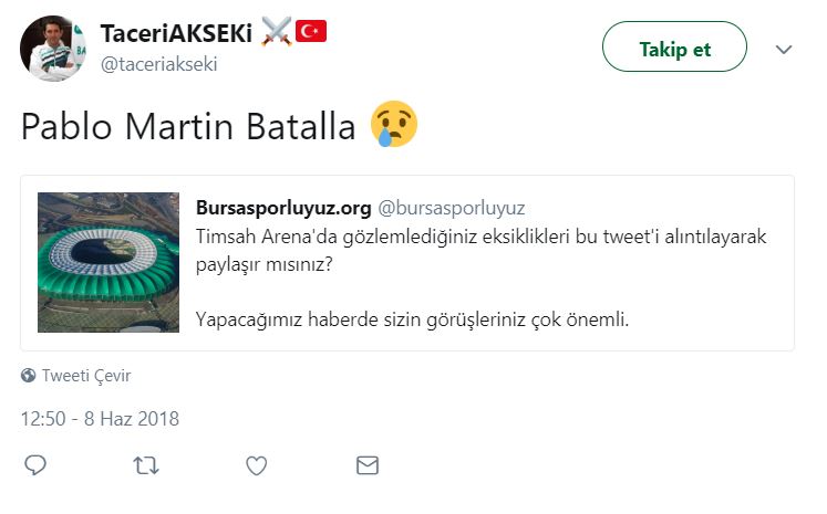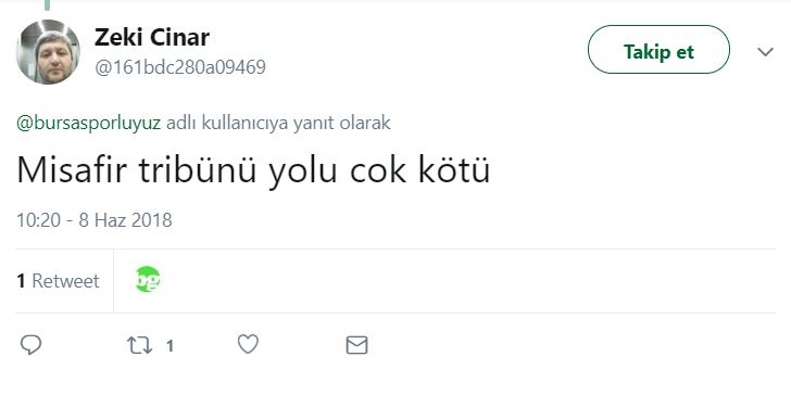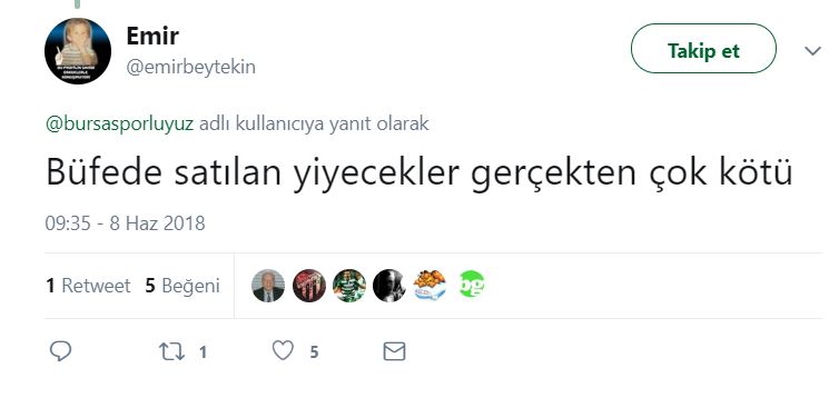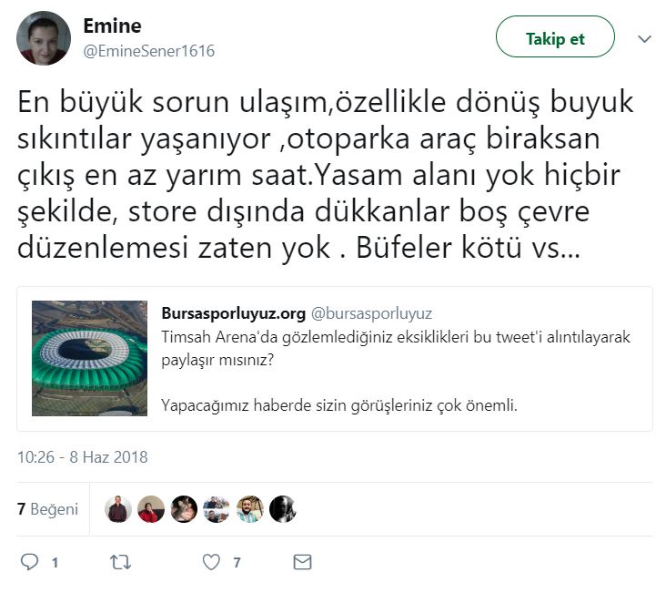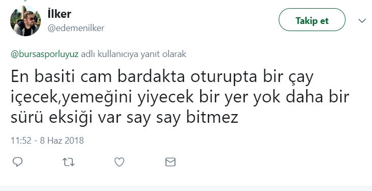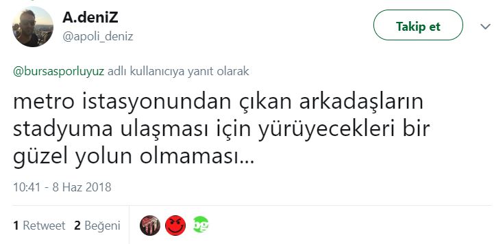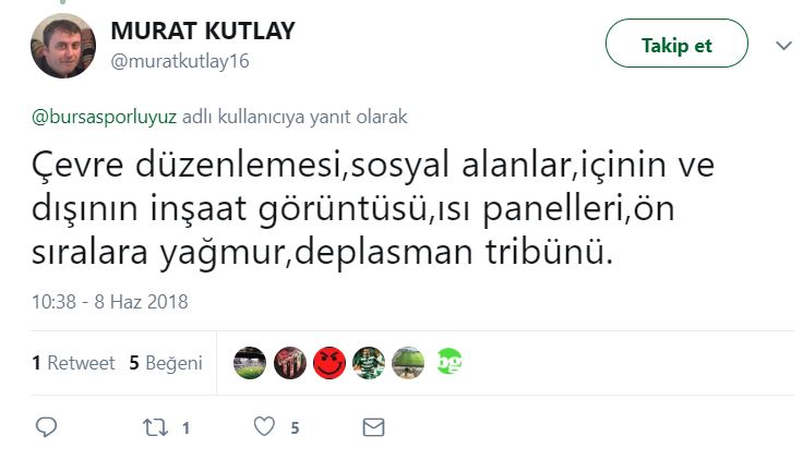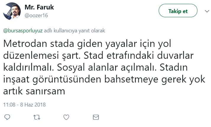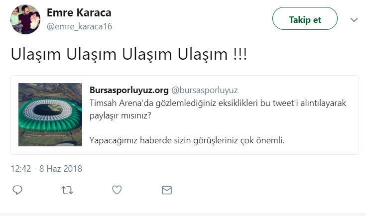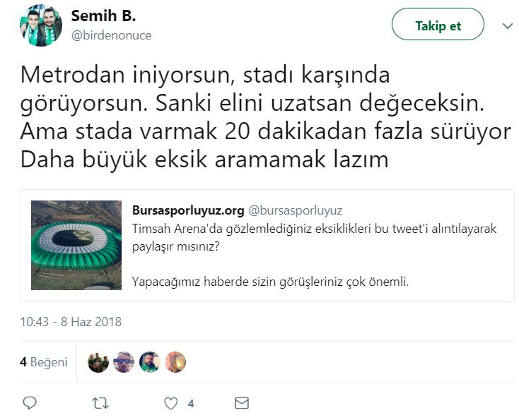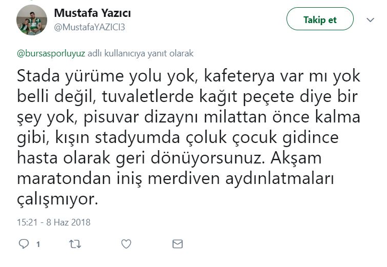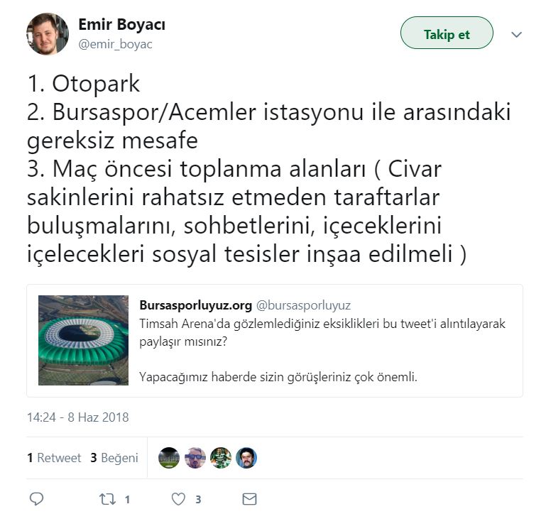Ulaşım bir dert başlı başına, sosyal alan yok, otopark sıkıntısı , maç çıkışlarını ise anlatmaya gerek yok , yollar yapılmamış, stadyuma gelirsek, stadyumu çevreleyen teller kesinlikle kaldırılmalı, timsah kafası ve stadyum içinde eksikler var, kale arkasındaki tel örgüler kaldırılmalı, maratondaki Bursa yazısı yerine Bursaspor yazılmalı koltukları ona göre dizayn edilmeli çünkü Bursaspor sadece futbol kulübü değildir, bir spor kulübüdür.Üç sıra boş bırakılmamalı,ön sıralara yağmur gelmekte çatıya koruma yapılmalı….Yani kısacası stadyumda eksikler var kaldırılması gereken işler var…Deplasman maçlarına mı geliyoruz yoksa kendi sahamızda maça mı geliyoruz belli değil..Timsah arenayı aktif ve yaşanabilir bir alan olması gerekir.