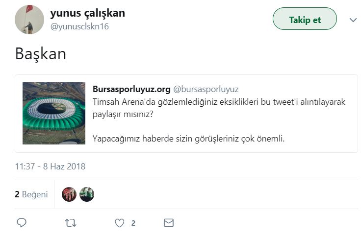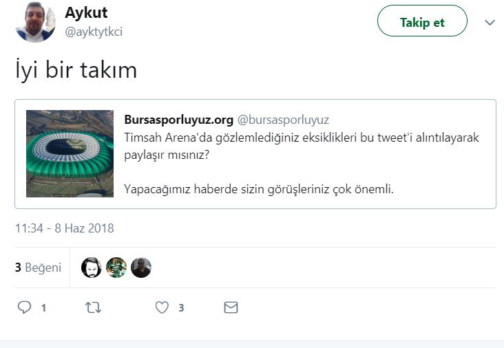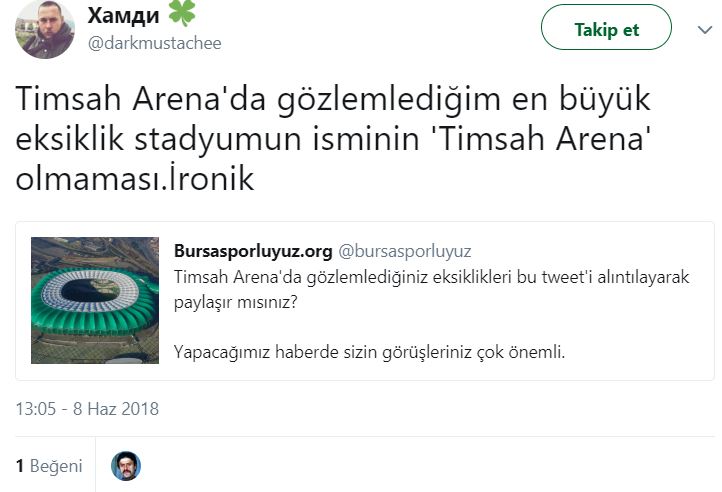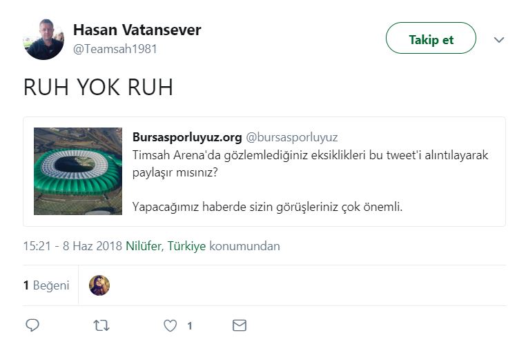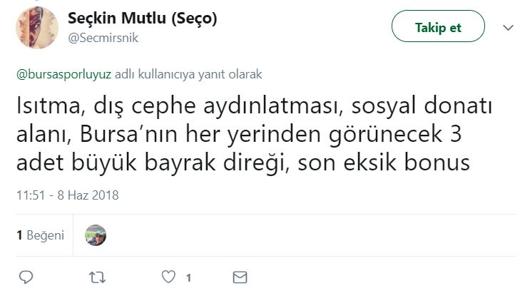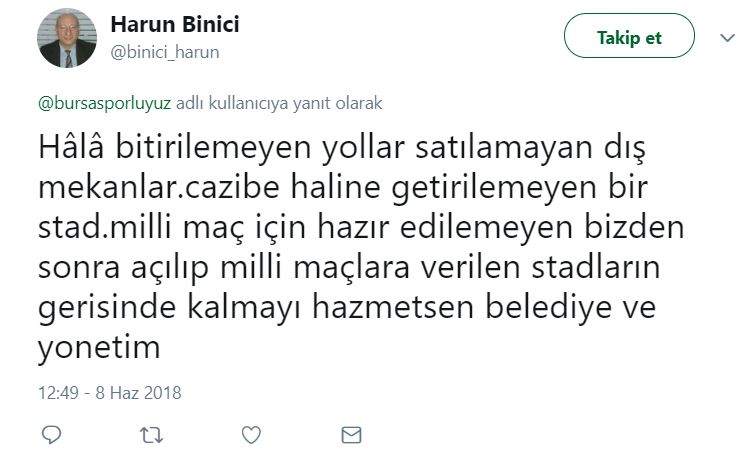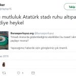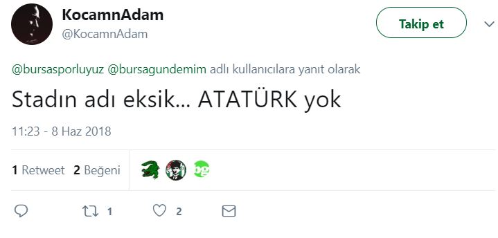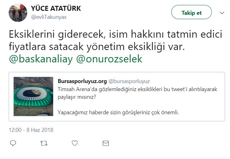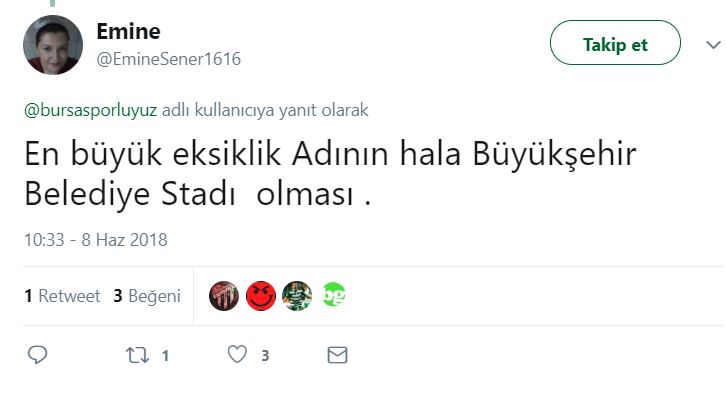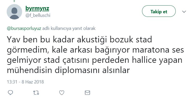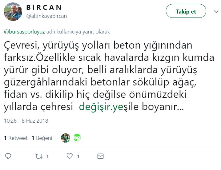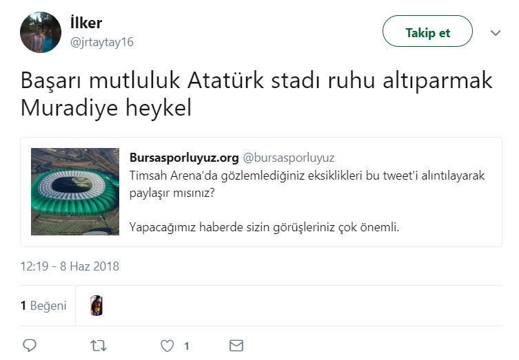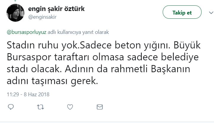 Belediye stadyumu ismi kaldırılmalı, stad bitmemiş kendi malın olmadımı bu hale geliriz.Rahmetli İbrahim yazıcının bir sözü vardı kongrede figuran olucaksa bu stadyum burda oynamanın hiçbir anlamı yok demişti daha o zamanlar görmüş rahmetli.Kimse Atatürk stadındaki heyecanı mutluluğu göremiyor timsah arenada…Bursasporun içine bu kadar siyaset sokulursa oyuncağı olursun…Kimse taraftarın sesini dinlemedi Atatürk stadına olduğu yere yapılacaktı…Bursaspor özüne döndüğünde mutlu başarılı, Siyaset sokularak değil..