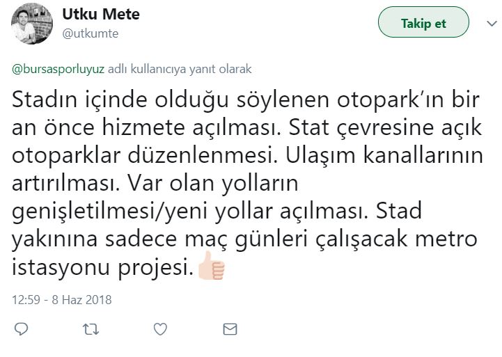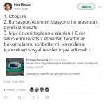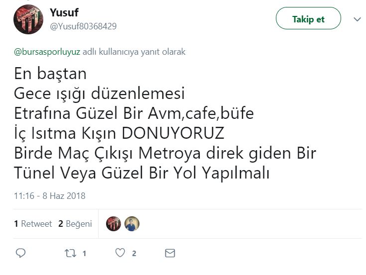 2-Stada gelen taraftarın evlerine dönüşünde BURSARAY tarafında bir hat olmalı ve o hattan sadece taraftarın evlerine gidecği istikamete o anlar için özel seferler yapılmalıdır.PROGRAM diyeceksiniz YAZILIMI YAPTIRIN İNSANLAR RAHAT ETSİN.
