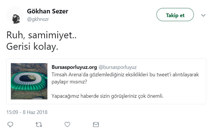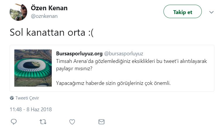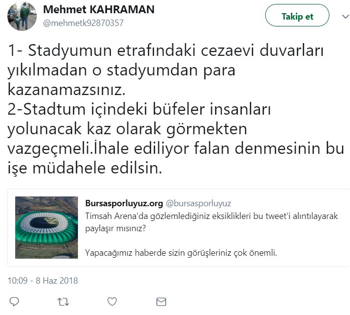 Tüm bu eksikler stada şuan gelen insanların yaşadıkları sıkıntıların ana başlıklarıydı. Bir de konunun ticari boyutu var. Bu haldeki bir stadta başta loca olmak üzere satılması düşünülen hiçbir markaya ve isim hakkına talip de çıkmaz. Bursasporlu olduğu için gelenler olsa da, olaya ticari açıdan bakacak firma ve kişiler bu haldeki bir yapıya yaklaşmazlar. İşin özü Timsah kafasından başlayarak, otoparklar, tuvaletler, çatı, çevresel eksiklikler giderilmeden Timsah Arena’dan istenilen verimi almak imkansız. Stadı yapan ve adını veren Büyükşehir Belediyesi Bursaspor’un daha fazla zarar görmesini istemiyorsa yeni sezona bu eksiklerin tamamını gidermelidir.