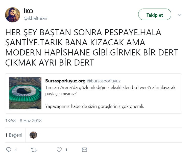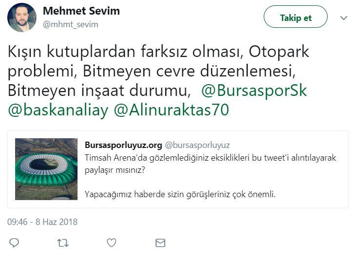 Bursaspor’un bir türlü bitmeyen stadı Timsah Arena’nın eksikliklerini Twitter adresimizden taraftarımıza sorduk.