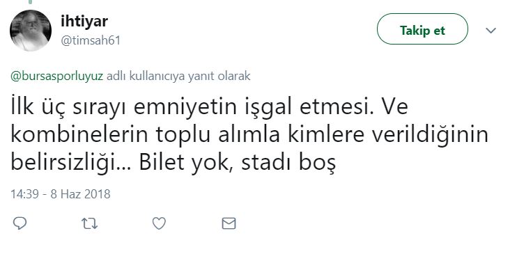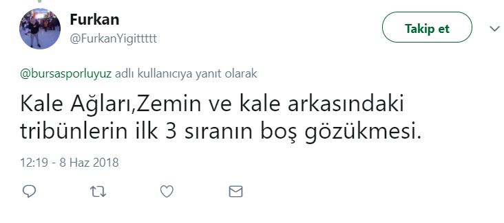 Lig maçlarında Bursaspor tribünlerine uygulanan ilk üç sıra boşluk bırakılması veya üç sıra Polis koruması kararının bu sezon sonlandırılması. Süper Lig‘e yükselme maçında bu uygulamanın yapılmadığını gördük.