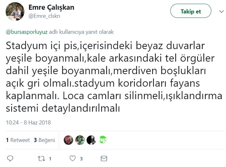 Ben koltuk renklerinin hepsini tek renk yeşil olmasını çok istiyorum ayrıca duvarlarda boyanmalı kale arkası teller kalkmalı ama bunları bu yönetimin yapacağından asla emin değilim