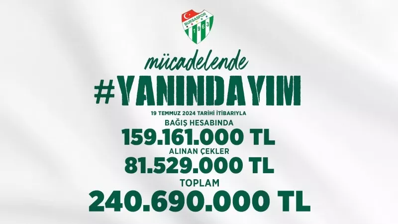 Bursaspor kulübü “Yanındayım” kampanyasında 19 Temmuz 2024 tarihi itibariyle toplam bağışın 240.690.000 TL olduğunu açıkladı.