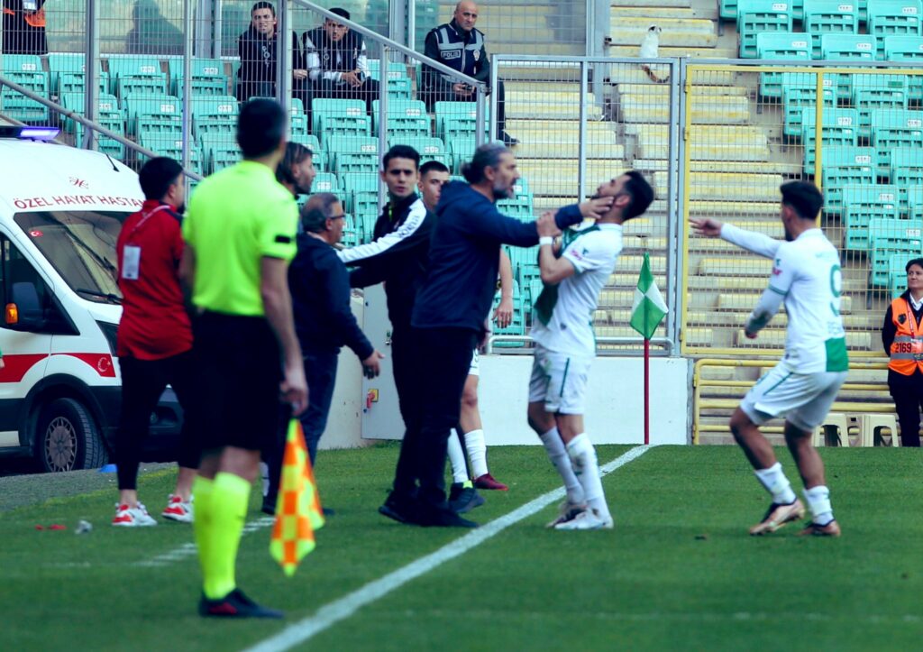 Bursaspor'un 2-1 kazandığı Anagold 24Erzincanspor maçında rakip takımın teknik direktörü Ahmet Yıldırım, önce sözlü tartışmaya girdiği Hasan Ayaroğlu’nun daha sonra boğazını sıkmıştı.