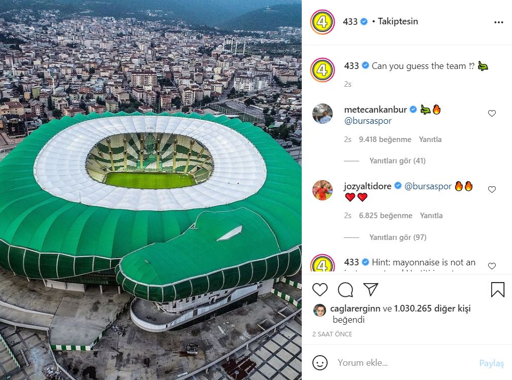 Dünyaca ünlü sosyal medya hesabı 433'ün Timsah Arena paylaşımına Bursaspor'un eski oyuncusu Jozy Altidore'dan cevap geldi.