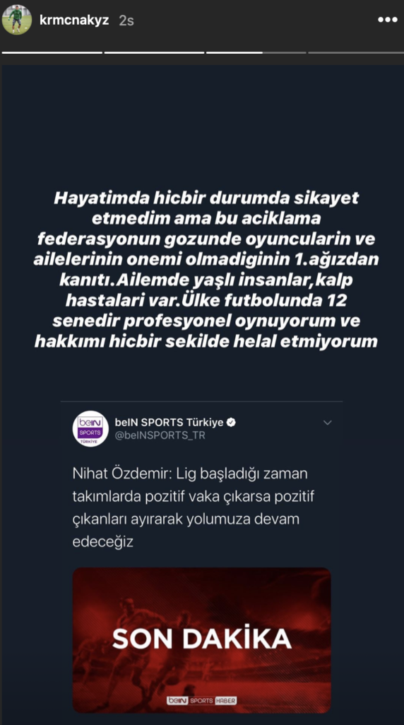 Instagram hesabından Türkiye Futbol Federasyonu Başkanı Nihat Özdemir‘in “Lig başladığı zaman takımlarda pozitif vaka çıkarsa pozitif çıkanları ayırarak yolumuza devam edeceğiz.” açıklamasını paylaşan Kerem Can Akyüz‘ün paylaşımı şöyle;