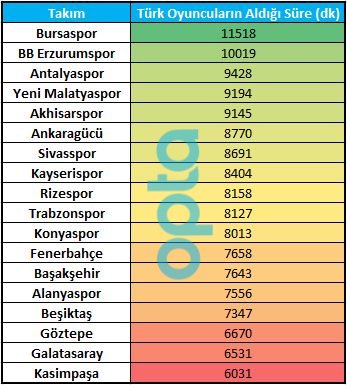 Bu sezon Süper Lig takımlarının Türk oyuncularına verdiği sürelerde Bursaspor zirvede yer alıyor.