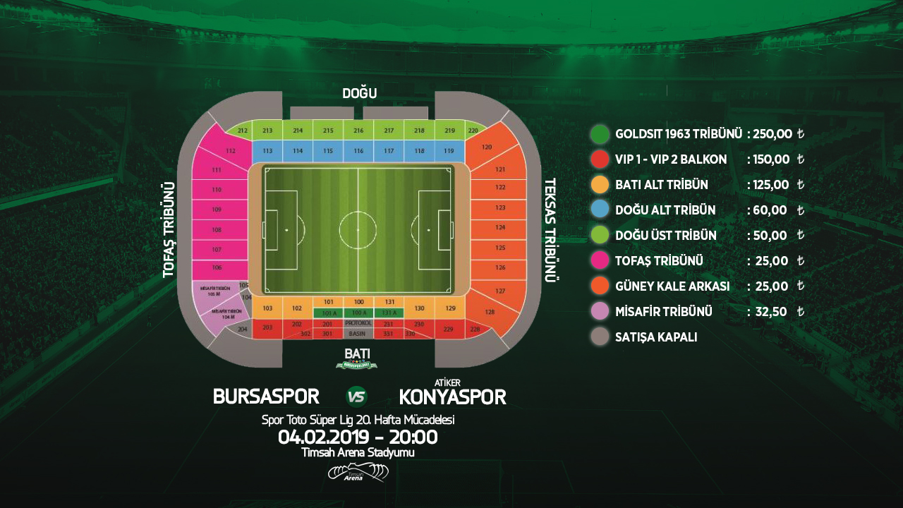 Bursaspor Kulübü Spor Toto Süper Lig’in 20.hafta karşılaşmasında 4 Şubat 2019 Pazartesi günü saat 20:00’de Büyükşehir Belediye Stadı'nda oynanacak olan Konyaspor maçı biletlerinin 31.01.2019 Perşembe günü saat 11:00 itibariyle satışa çıkacağını açıkladı.