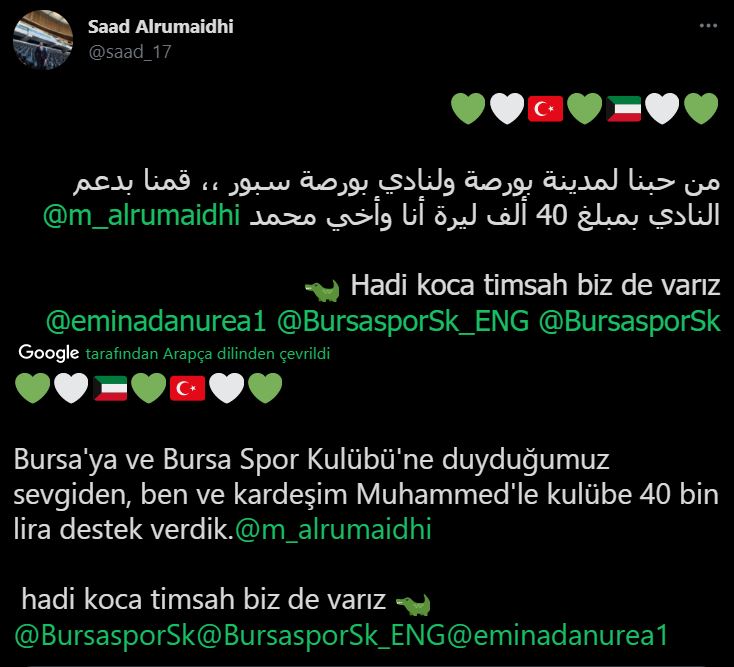 Bursaspor Kulübü resmi sosyal medya hesaplarından “Ayağa Kalk Bursa” hareketine 40.000 TL katkıda bulunan Fc Kuwait City Akademisi Sahibi Saad Alrumaidhi'ya teşekkür etti.