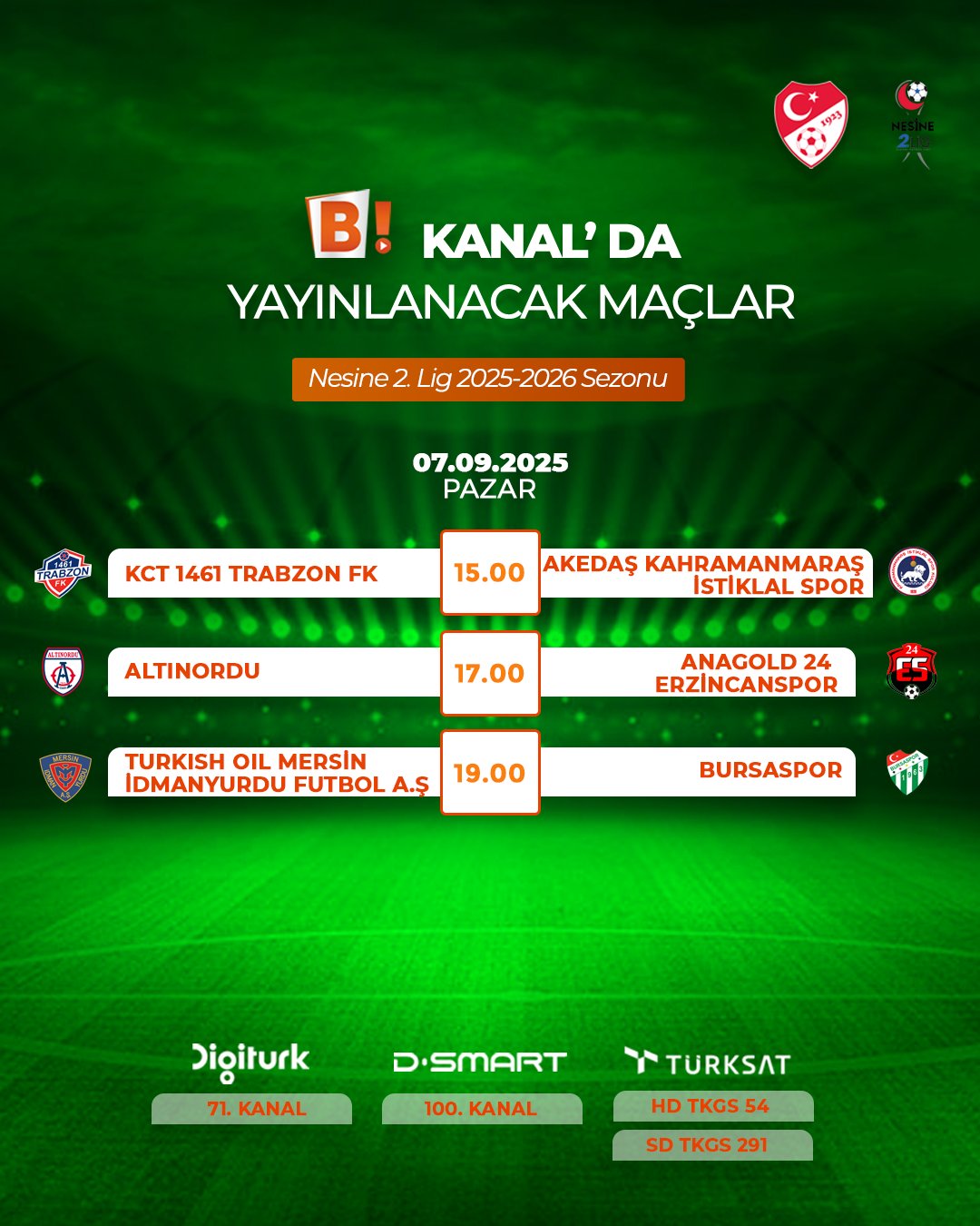 7 Eylül Pazar günü saat 19.00’da başlayacak Mersin İdmanyurdu-Bursaspor karşılaşmasını Bi Kanal canlı yayınlayacak…