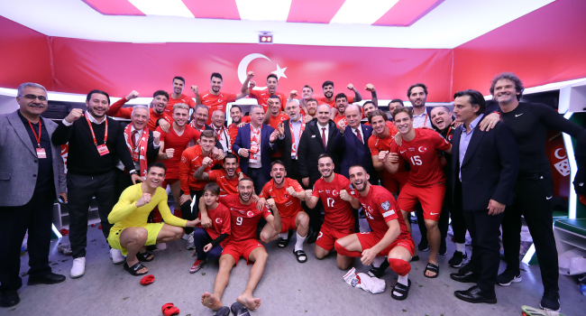 Tribündeki seyircilerle sevinçlerini paylaşan millilerin coşkusu soyunma odasında da sürdü.