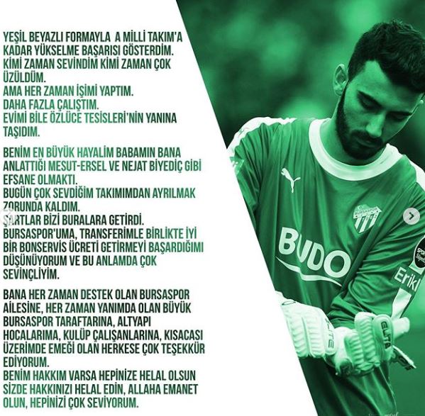 Bursaspor'dan Başakşehir'e transfer olan Muhammed Şengezer sosyal medya hesabı instagram'dan bir veda mesajı yayınladı.